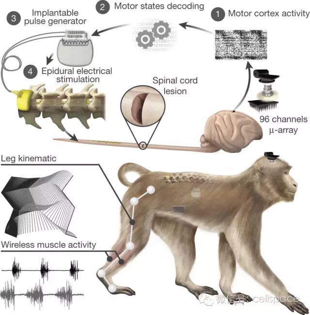 这一研究项始于10多年大鼠实验经验,最新猴子实验验证了大鼠的研究结果。开始阶段使用健康猴子,研究大脑发射电子信号到腿部肌肉,让猴子在跑步机上行走。他们还研究了腰椎,这里是大脑信号传递到腿部肌肉的中转站。然后他们在脊髓切断猴子用无线电重新创建这些信号联系。瘫痪猴子大脑植入微电极阵列,电极采集大脑神经元信号,解析与下肢运动有关的信号,然后将这些信号发射出去被脊柱附近的接受器接受,接收器发出刺激下肢肌肉运动神经元的信号,实现支配下肢运动的目的。