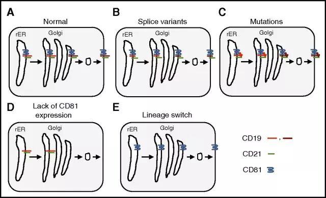 CD81属于跨膜4超家族成员,也称为四次跨膜蛋白超家族。它表达广泛,并在受体信号传导、细胞粘附和肌管维持中发挥着作用。此外,它是人类丙型肝炎病毒进入肝细胞的受体。人类中的CD81缺陷的症状主要表现为体液免疫缺陷,也就是常见的可变免疫缺陷类型6。在CD81敲除小鼠中的研究发现CD81与rER中的CD19具有相互作用,并且对CD19转运至细胞表面是至关重要的因素。因此,当研究人员检查了患者CD19的糖基化状态时,发现这名患者的CD19糖基化不完全,表明这个案例中CD19-免疫逃逸的原因来自于CD81表达的缺失,从而导致ER和/或者高尔基体中的CD19出现转运和/或者成熟缺陷。不过需要更详细的研究来找出CD81表达缺失的机制,因为研究人员没有观察到CD81基因出现表达突变或转录沉默。