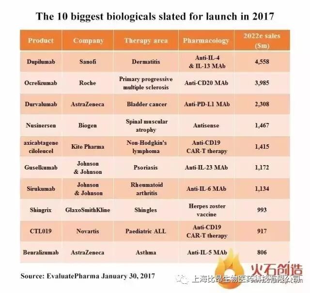 EP Vantage预测了十大有望在2017年推出的生物制剂5年后的销售额情况。笔者对此一一进行了介绍和分析。