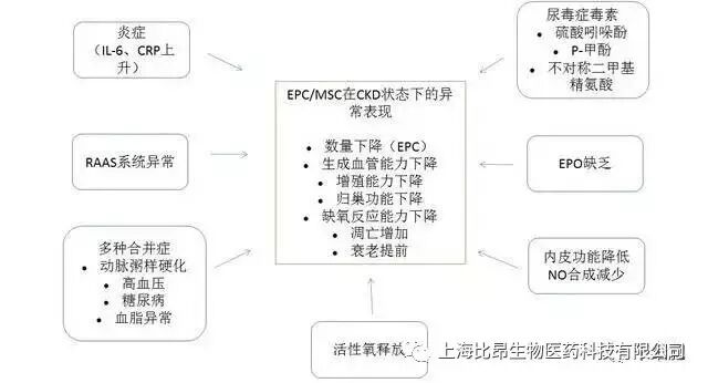 与健康人群相比,EPC 在 CKD 患者中数量明显减少,间充质干细胞数量是否减少尚没有肯定的结论。但这两种细胞的功能均有所下降。其可能的影响因素包括炎症、肾素 - 血管紧张素 - 醛固酮(RASS)系统激活、多种合并症、尿毒症毒素、促红细胞生成素(EPO)缺乏、内皮功能障碍。