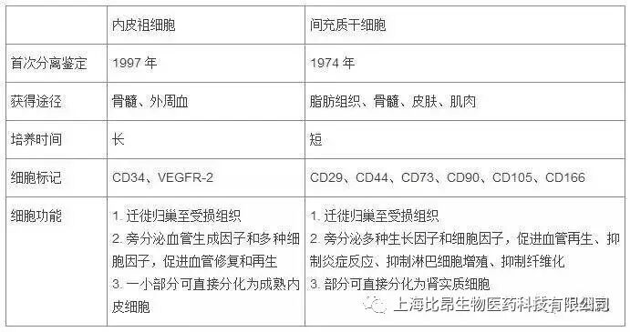 表 1、内皮祖细胞与间充质干细胞的比较