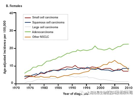 图2 1973~2010年,根据性别和组织学(年龄调整为2000美国人群)的标准肺癌发病率