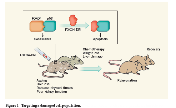 具体来说,该研究证明,这一对抗衰老细胞的分子能够逆转衰老相关的皮毛损失、肾功能受损以及虚弱(frailty)。研究中使用的这一分子的作用机制是:阻断衰老相关蛋白FOXO4的一种能力,即告知另一种称为p53蛋白,不要让衰老细胞自我毁灭。通过干扰FOXO4-p53之间的作用,该肽分子能够引发衰老细胞凋亡或者自杀。