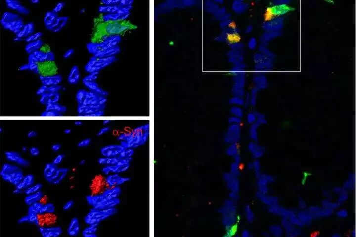 在人类结肠组织中,用荧光染色可以发现内分泌细胞(绿色荧光)中存在α-synuclein(红色荧光)。图片来源:JCI