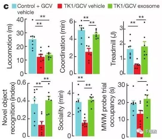 ▲外泌体的注射(绿色)使小鼠的多项运动能力和认知能力得到了提升 (图片来源:《自然》)