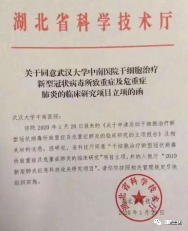 ✓ 湖北省科技厅同意干细胞用于新冠病毒所致肺炎的临床立项